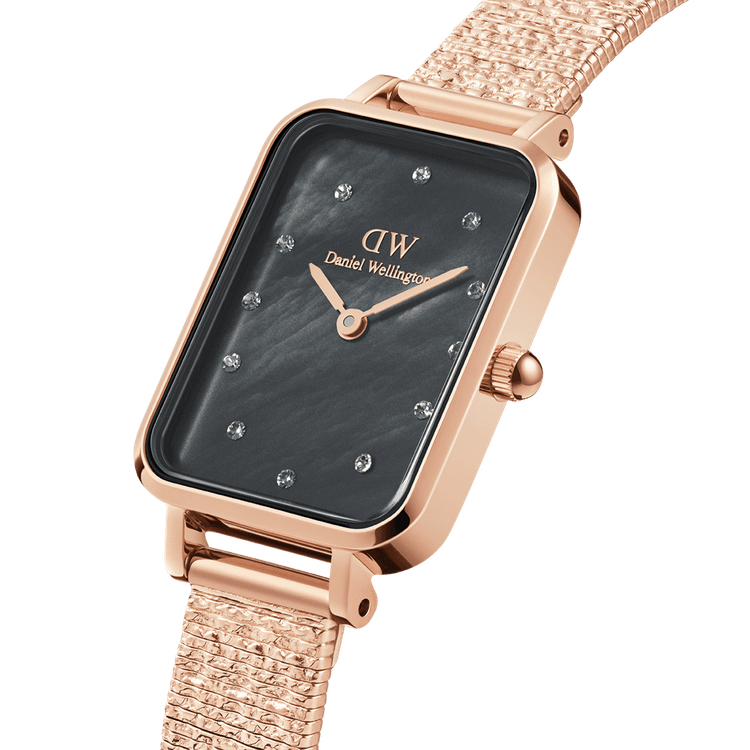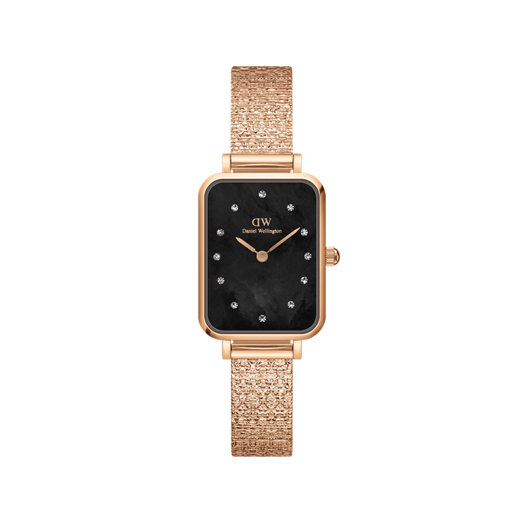 ساعت دنیل ولینگتون مدل QUADRO LUMINE PRESSED PIANO - رزگلد صفحه مشکی کهکشانی نگین دار (زنانه)